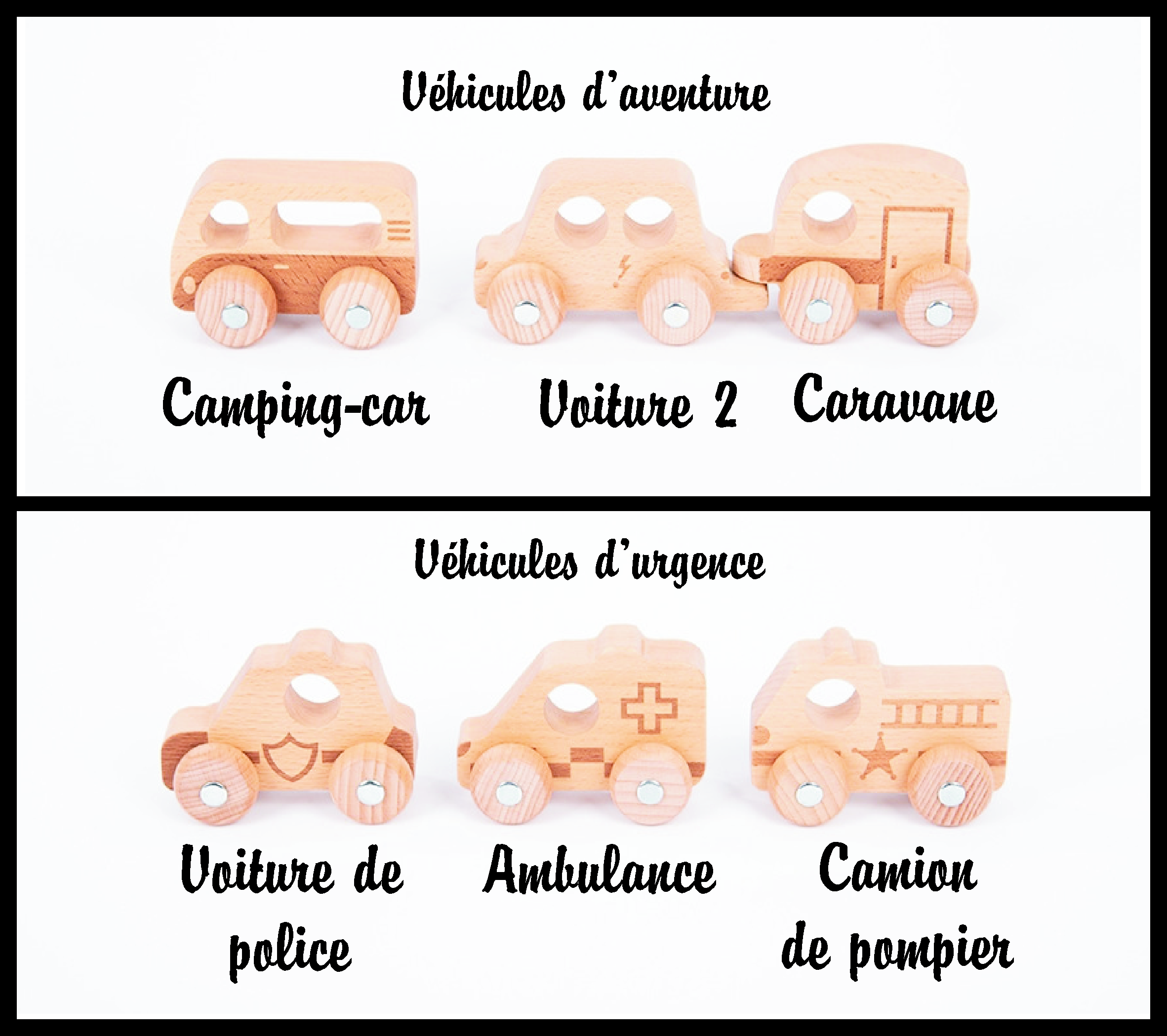 De beaux véhicules en bois naturel, chacun avec quatre roues rotatives, des essieux en métal et des marquages au laser. La gravure au laser crée une légère empreinte dans le bois, rendant les pièces tactiles pour offrir un aspect de découverte sensorielle.