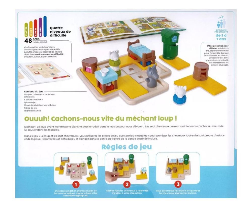 Découvrez le jeu Le loup et les 7 chevreaux de Smartgames, un jeu de logique et de réflexion avec 48 défis conçu pour les enfants de 3 à 7 ans.