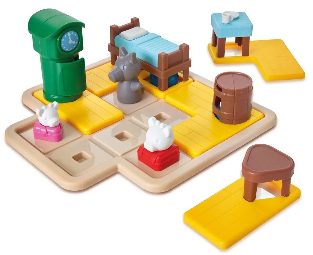 Un jeu de placement où vous devrez placer le loup et les chevreaux dans leur bonne orientation comme indiqué dans le défi, puis cacher tous les chevreaux sous ou dans les meubles à l’aide des pièces "meuble" nécessaires. Il n’y a qu’une seule solution que vous trouverez au verso de chaque défi.