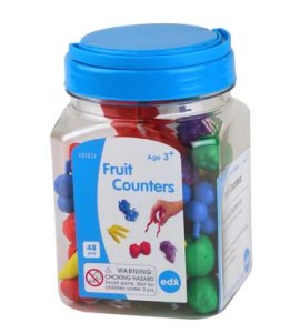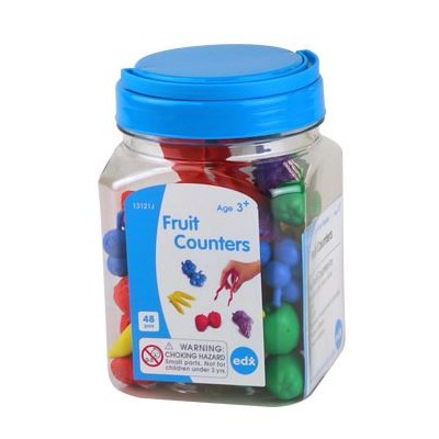 Un pot de 48 pièces en forme de fruits avec une pince à épiler et un guide d'activités, idéal pour compter, trier, créer des motifs et utiliser avec des processus mathématiques simples: addition, soustraction, division et multiplication.