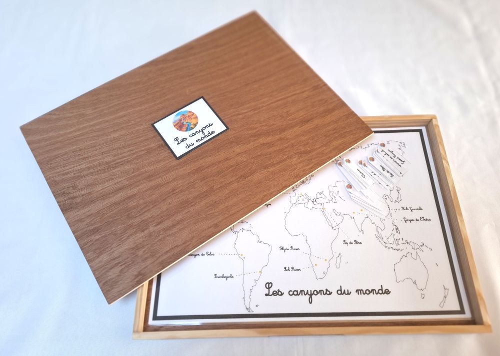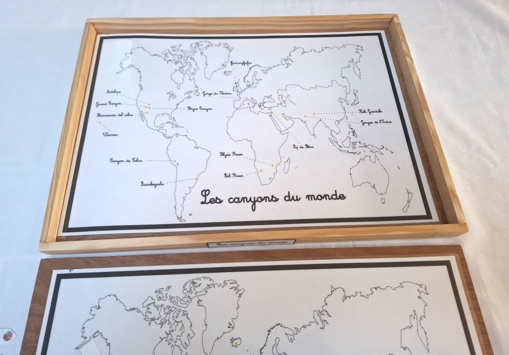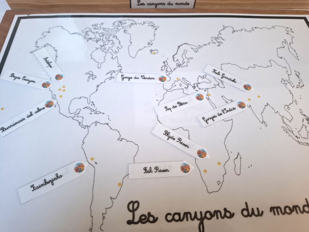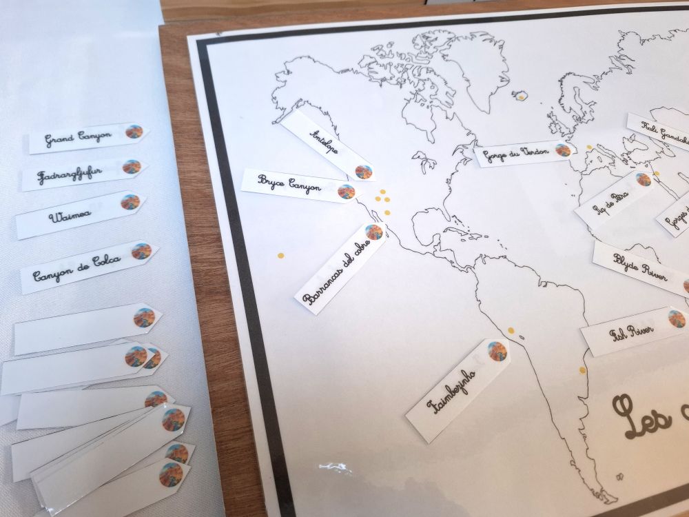 Avec ce matériel, l'enfant doit chercher les canyons du monde sur le planisphère avec les flèches amovibles.